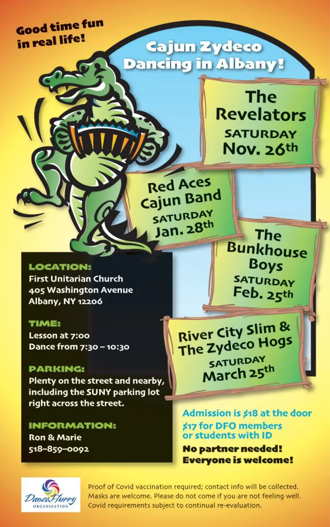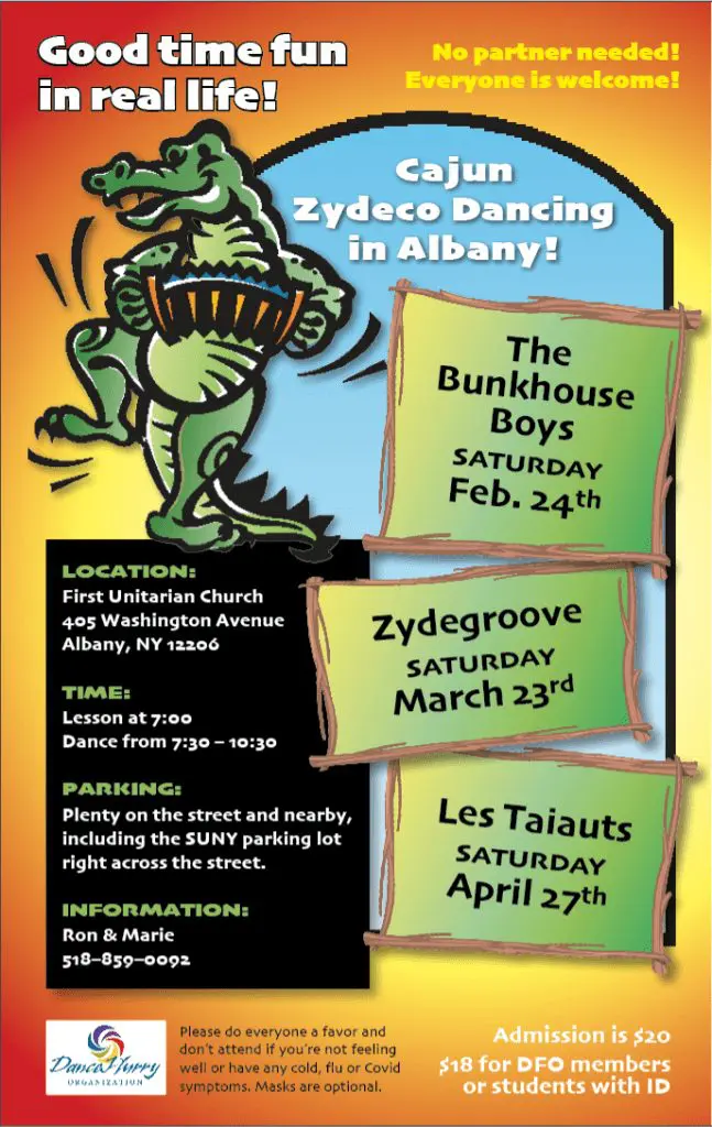 COVID Procedures: Please do everyone a favor and don’t attend if you are not feeling well or have any cold, flu, or Covid symptoms. Masks are optional. For more information, call 518-859-0092.