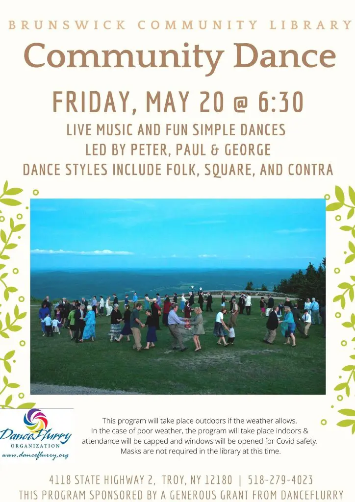 Community Dance A DF-YO grant funded an outdoor community folk dance at the Brunswick Library on May 20, 2022, with Paul Rosenberg calling for George Wilson, Peter Davis, and Patricia Kernan.