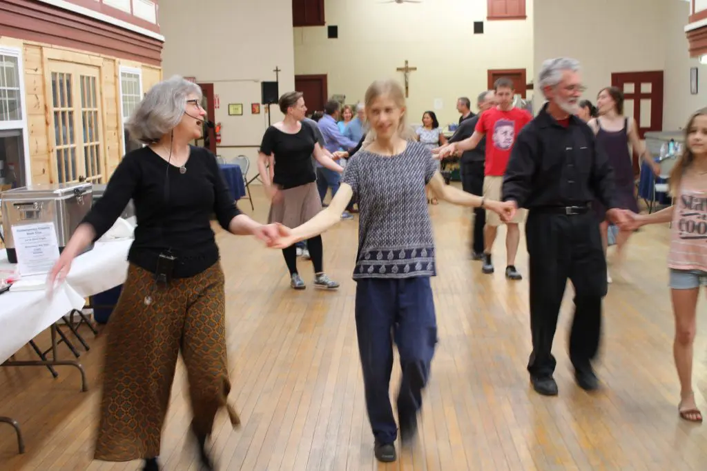 This event on June 1, 2019 featured caller Fern Bradley and music by the event organizer-named Library All-Stars Band (George Wilson, Bonnie Epstein, John Guay, Vonnie Estes). The free event was held for the third year at the St. Joseph’s Parish Hall in Greenwich, with support from the Lower Adirondack Regional Arts Council and a program grant from DanceFlurry. Starting out with easy family dances and progressing to contras later in the evening, this dance was part of the Greenwich Free Library’s MUSIC IS LIVING HISTORY series.