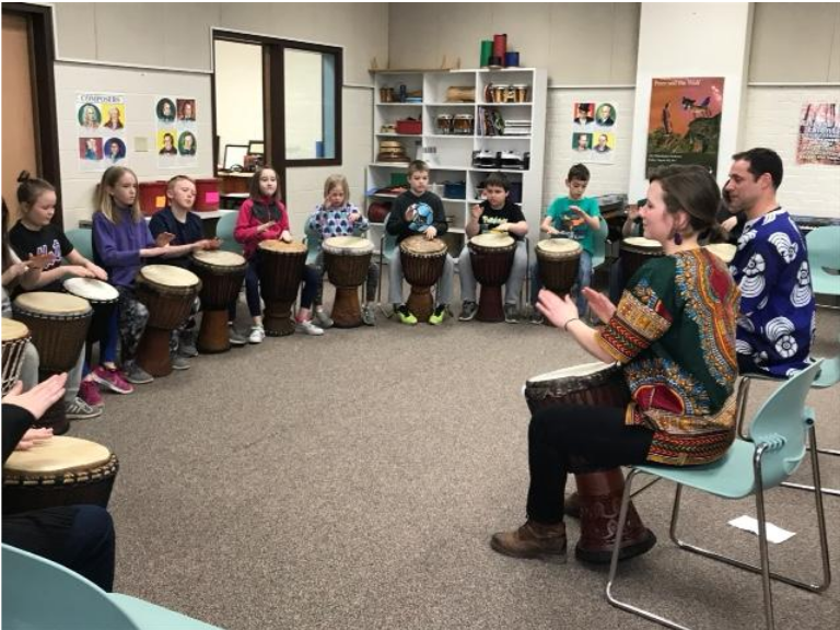On April 12, 2019, three 4th grade classes of Tony Califano’s Music and Arts program had the privilege of attending drumming workshops by Chelsie Henderson and her husband, Wayne White (Rural Soul Studio) at the Greenwich, NY public school.